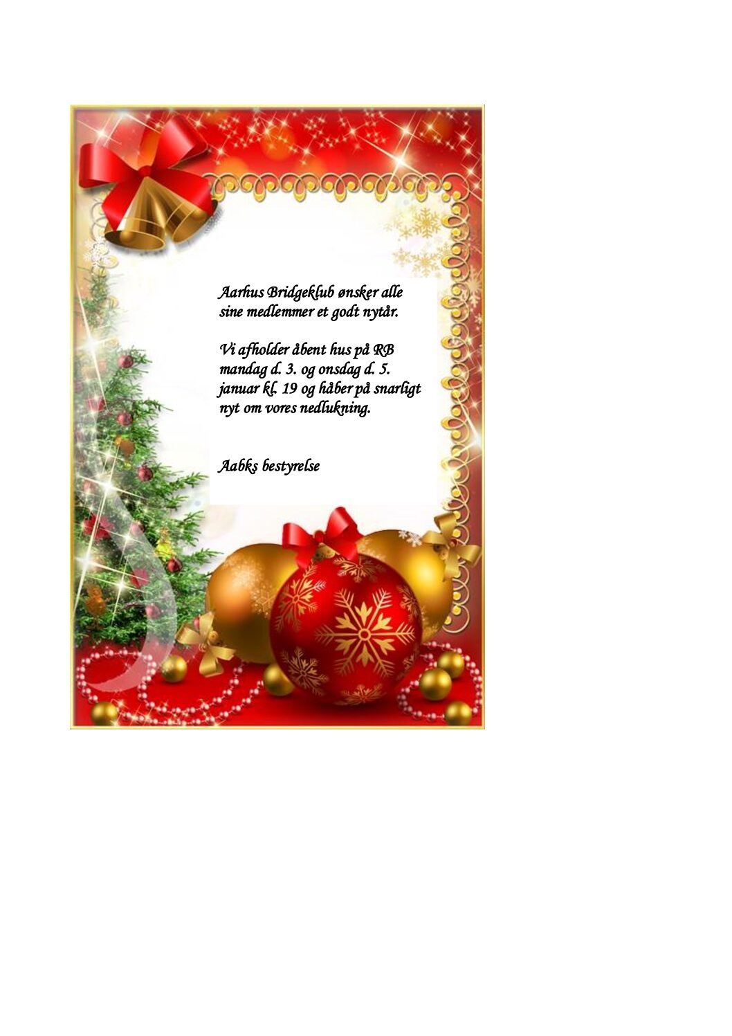 Efter udmelding fra Bridgeforbundet må Aabk midlertidigt lukke ned. “Som forventeligt blev indstillingen fra Regeringen om skærpede og nye coronarestriktioner godkendt i går i Epidemiudvalget. Det betyder, at restriktionerne træder i kraft fra søndag d. 19. december kl. 8.00. DBf har…